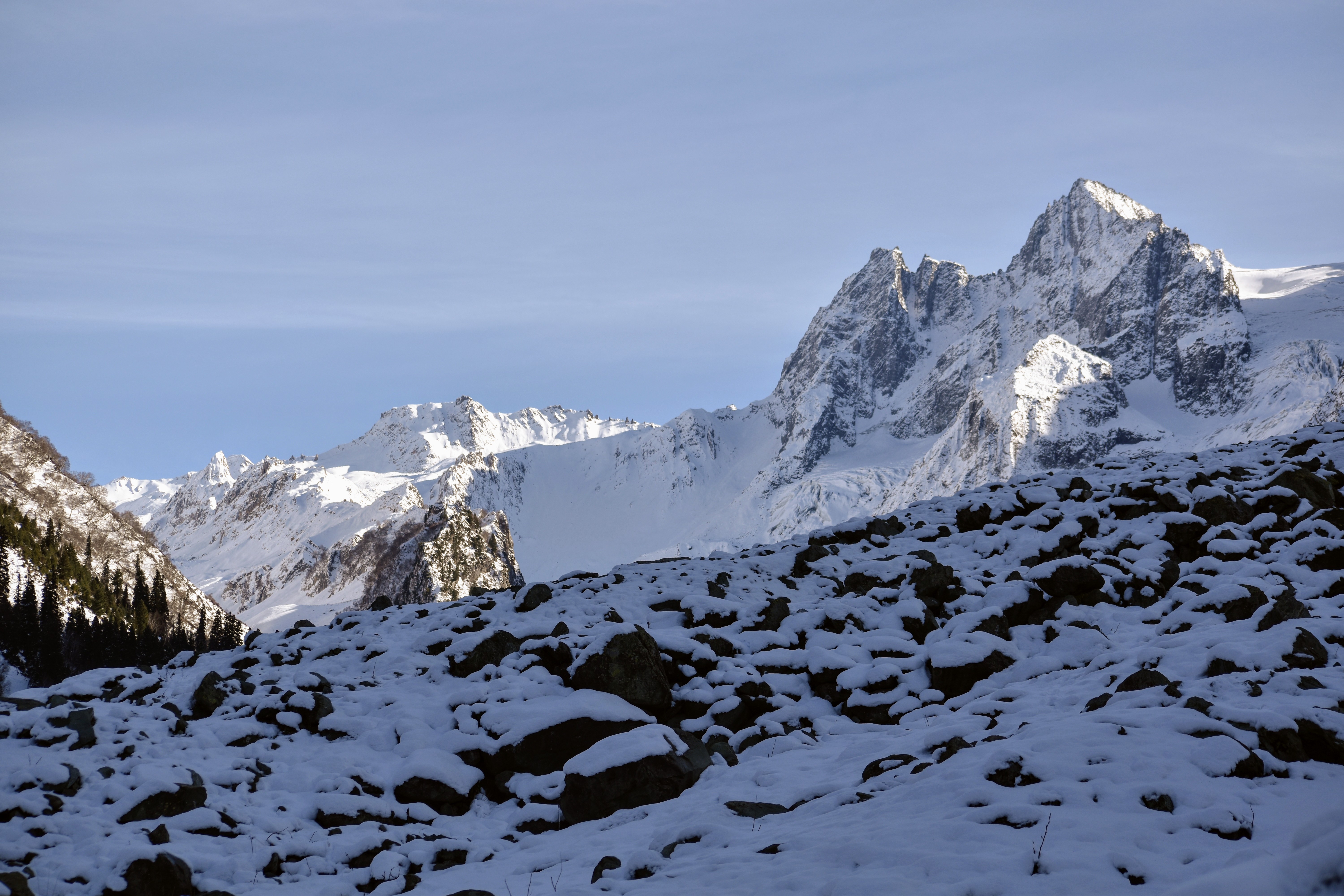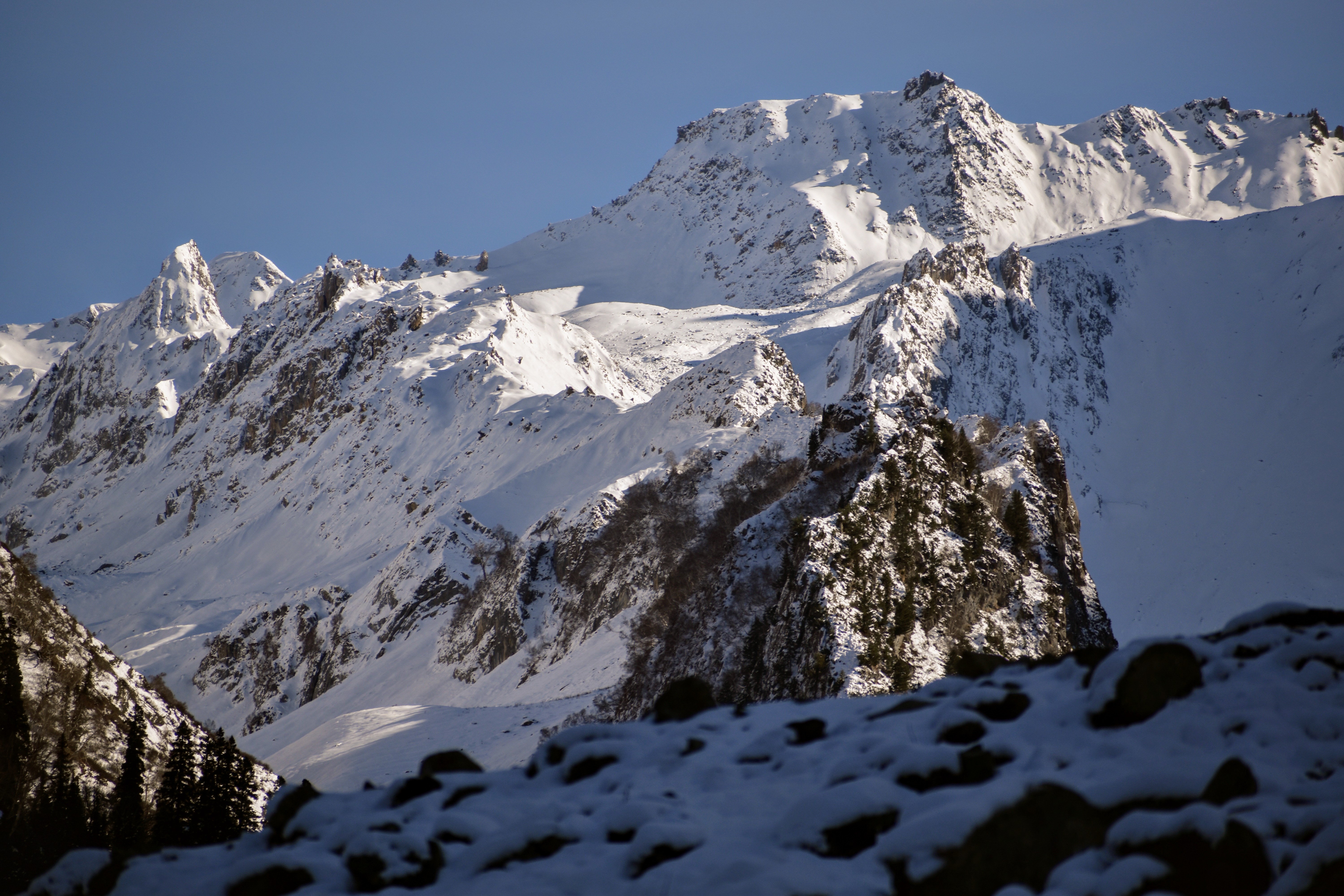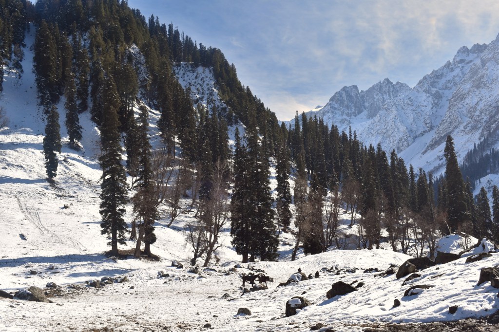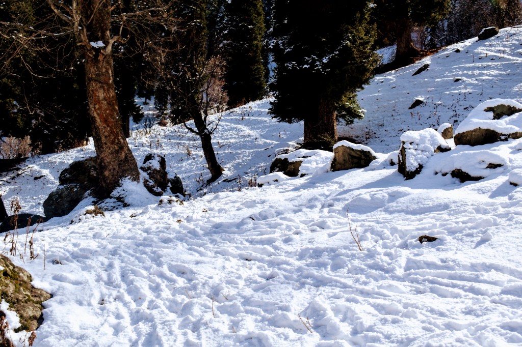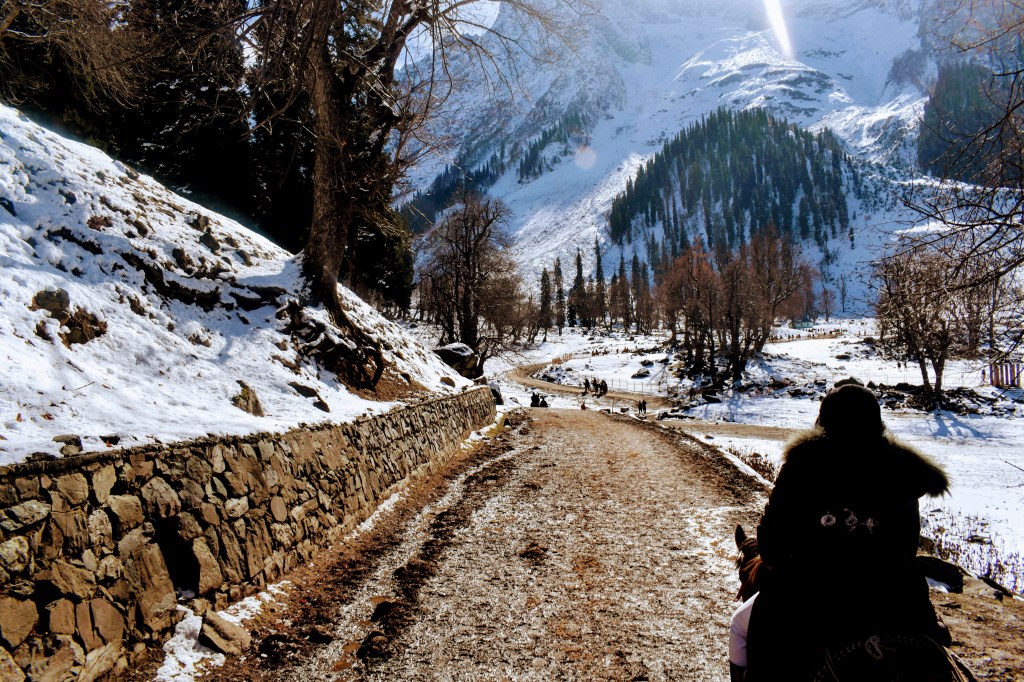 It took us about 50 minutes of riding along a bumpy, snow-lined path to reach the snow point. Across a narrow stream, the area was blanketed in several feet of fresh snow. We dismounted, ready to enjoy some snow-filled fun. From the snow point, the view of Thajiwas Glacier was absolutely mesmerizing. The towering peaks, coated in a thick blanket of snow, glowed with a golden hue under the soft sunlight, as if nature itself had sprinkled gold dust over them. The shimmering snow sparkled brilliantly, while the pine forests at the base of the glacier added a rich green contrast to the golden-white panorama. The gentle murmur of the nearby stream enhanced the serenity of the place, making it feel like we had stepped into a winter wonderland. Standing there, soaking in the beauty of the landscape, it was hard not to be overwhelmed by the sheer grandeur of nature.