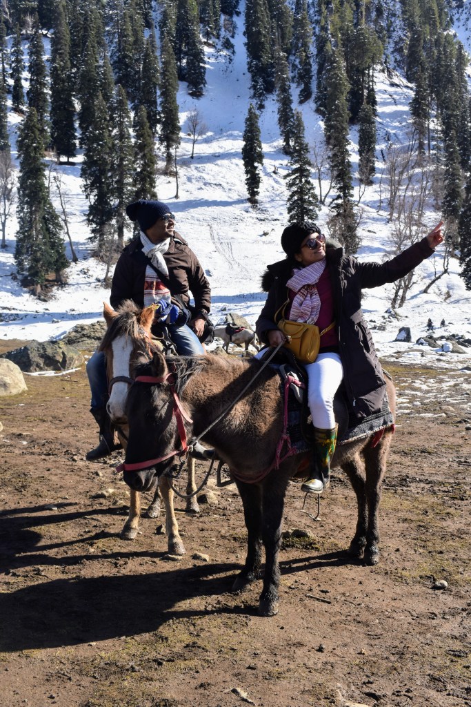 Our first challenge in Sonmarg was less about the cold and more about negotiating for a pony ride. After a round of haggling, we secured a deal and were introduced to our companions for the day. Our young guide, a cheerful local boy, acquainted us with the two ponies that would carry us through the adventure. Rustam—a lively, mischievous horse full of energy was mine to tame, while my husband rode Bijli, a calm, experienced mare with a temperament that defied her electrifying name.