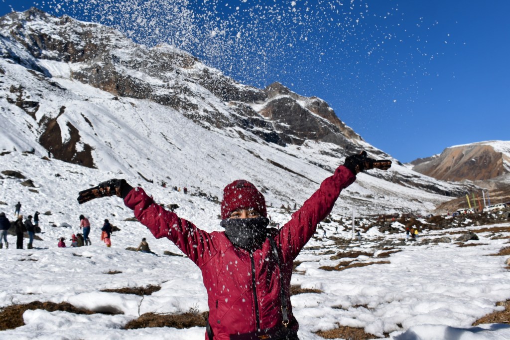 Snow begins to make its appearance gradually, until you find yourself surrounded by pristine white land that stretches as far as the eye can see. What makes Zero Point special is that despite the snow, the temperatures are surprisingly bearable. It’s perfect for a snowball fight, building a snowman, or just jumping around like a kid! But remember — go early. As the day progresses, fog sets in. It not only dampens the brightness of your photos but may also obscure the magnificent bird’s-eye view of Yumthang Valley. You might even encounter a light drizzle, which can further hinder the experience.