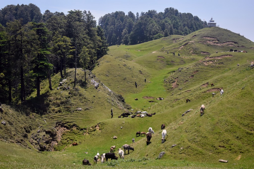 After an hour’s hike, we reached the meadow—and I was spellbound! Vast and undulating, this mountainous meadow held a charm akin to Khajjiar or Baisaran Valley, but without the crowds or development. All around, we saw only emerald grasses, tiny flowers, colossal coniferous trees bordering the meadow, and the endless sky. Cows, bulls, and horses grazed peacefully, with a couple of lonely dogs meandering about. Here, there was no noise, just pure, tranquil silence. All we could do was lie down, bask in the sunlight, and soak in the profound peace. (A note: the sun can get quite scorching sometimes, so carrying an umbrella is a good idea!)