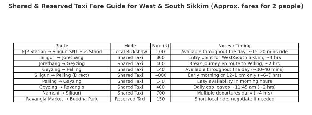 - From Ravangla, shared taxis run to Singtam, Namchi, Gangtok, Geyzing, and Siliguri.